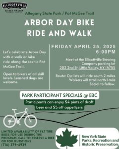 On Friday, April 25th, between 6-8pm, bikers and walkers will celebrate Arbor Day on the Pat McGee Trail in Allegany State Park. They’ll begin by gathering in the parking lot of Little Valley’s Ellicottville Brewing Company (202 2nd Street), then the bikers will bike two miles south towards Salamanca, while the walkers will walk one mile north towards Cattaraugus to the Wetlands to see birds. For questions or to use bikes, contact the Environmental Education Recreation Department at (716) 379-6939.