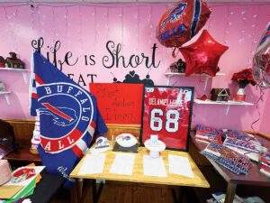 In addition to the silent auction, there will be a Chinese auction featuring some amazing Buffalo Bills-themed baskets, an Ed Oliver jersey, a Frank Gore jersey, decorative Bills throw pillows, handbags, and other Bills merchandise, as well as additional baskets and gift cards. For just $5, you can purchase tickets that give you 11 chances to win. Many of the items are already on display at the bakery, and you do not need to be present on August 17th to win. Feel free to stop by U Take the Cake a head of time to browse at the Chinese auction items and purchase tickets for your chance to win.
