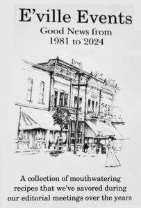 MJ Brown popped into my home today and brought me a fresh copy of a new, hot off the press E’ville Events cookbook. Those of you who have faithfully followed this E’ville Events community publication since its beginning in 1981 are sure to recognize any number of the recipes found in this book. They were all printed within the pages at one time or another – treasures from family and friends that have been passed down through generations, or new delights that made the news pages, generally tested by the team in the OBCC (Old Broad’s Command Center – a dedicated room in Teresa Mercer’s home, with glitter, glitz, lights and pin-ups.) After all, “All work and no play …” well, you know.