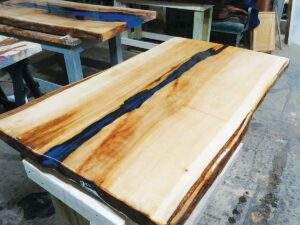 Jean and Justin have both been woodworking for over 10 years, and run 2 sawmills, one can mill logs up to 76” in diameter. Both specialize in different aspects of the process. Jean does the more artistic epoxy and finishing work while Justin runs the mills and does the processing. They’ve found a niche in large, live edge slabs, which are often used for tables and/or sold to other craftsman for both professional and DIY projects. Over the years, they’ve created a variety of products, including coffee tables, mantles, shelves and charcuterie boards. They’ve also completed many custom orders, and a variety of their projects can be found in the shop.
