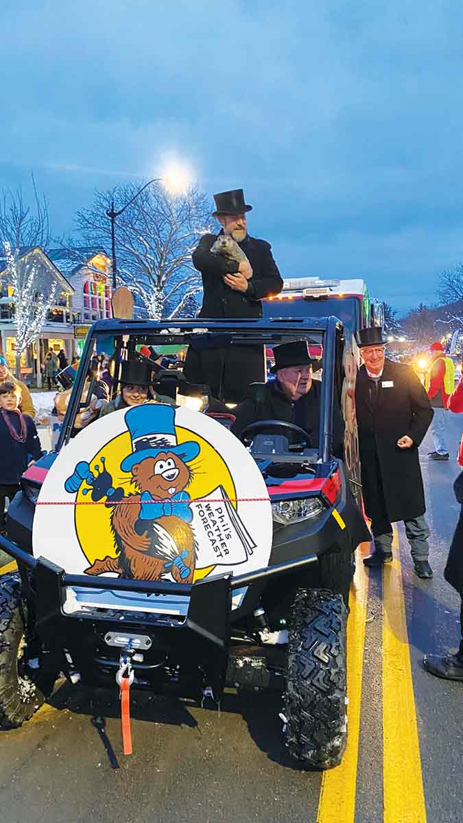 Traditionally, every year, the 15 Inner Circle members – in their top hats and formal attire, and thousands of Phil’s admirers gather at Gobblers Knob on February 2. The Handler knocks on the door of his den three times and scoops him out, sets him down and allows him to prognosticate. (Now, Phil’s not another Caleb Weatherbee, who is the official forecaster for the Farmer’s Almanac but they share one thing in common – the name Weatherbee is as eternal as is Phil, since the name (a pseudonym) has been passed down for generations possibly since 1818.) How often is Phil correct? Go to their website (groundhog.org) and search it out for yourself. But, truly, does it matter? What’s more fun is imagining his story and finding your own shadow or sunshine. Rest assured; Mother Nature will still do what she wants to do. Happy Groundhog Day! Look for Phil at the Parade!
