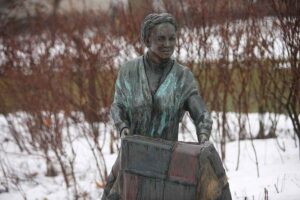 Locally we can find reference to persons involved in this rescue operation across the state. In Cattaraugus and Chautauqua counties, hundreds of underground railroad individuals moved these runaways using the Allegheny River, Ischua Creek and numerous back roads or paths through towns like Olean, Ellicottville, Cadiz, Jamestown, Sherman, Versailles, Dunkirk, etc. A memoir written by a Chautauqua County U.G.R.R. conductor, Eber Petit, The History of the Underground Railroad, names persons and places of those who gave refuge, food, clothing and means of travel at great personal peril to themselves and their families. The Darwin Baker Museum in Fredonia and The McClurg Museum in Westfield both have displays accounting these events. The Fenton History Center in Jamestown holds information about stationmaster, mixed-race Catherine Harris – likely the very first “colored person” in 1831 Jamestown. In 1835 she moved into a 16-foot Long House (which allegedly could hold up to 17 runaway in its attic!). She was one of the few blacks to maintain a station. Her bronze statue stands in Dow Park.